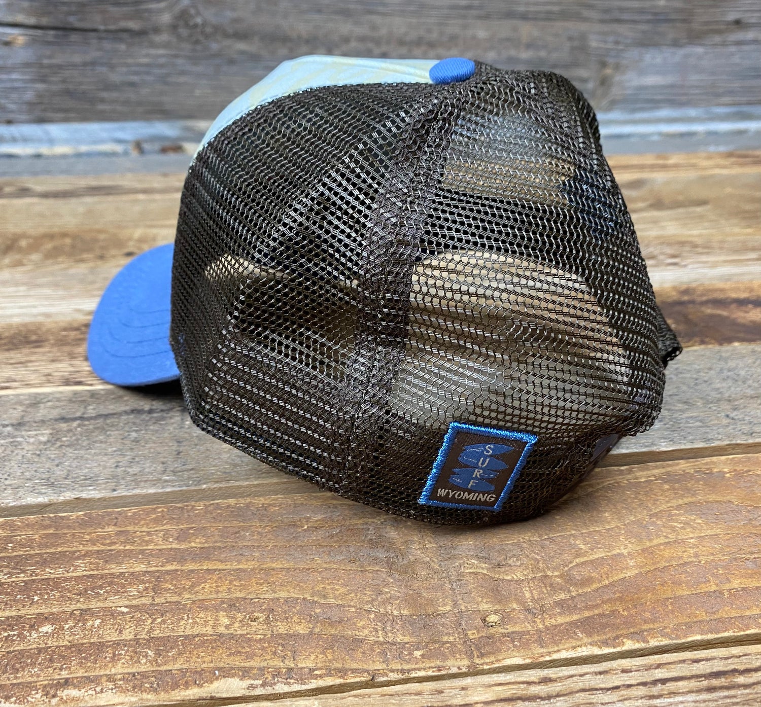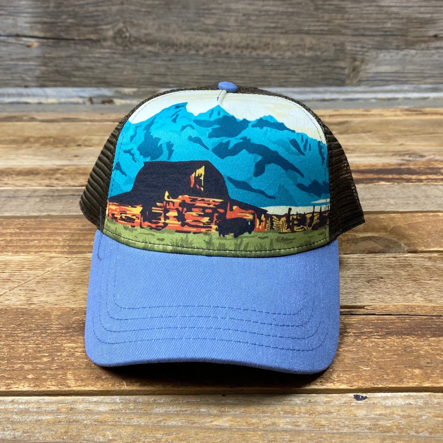 Our Surf Wyoming Barney trucker has a 2-panel structured low crown, full mesh back and a one-size-fits most adjustable closure. Custom designed with a slightly curved bill for a comfy and natural worn-in look and complete with our hand drawn, artist series Wyoming Barn art.