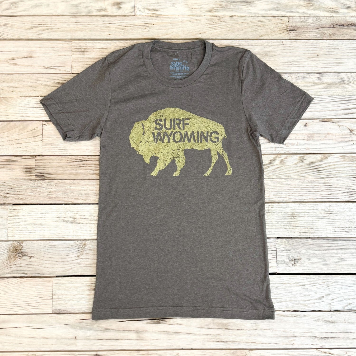 Surf Wyoming’s iconic logo tee with a new gold metallic bison on our super soft tee in heather brown. A nice contrast that pops.
