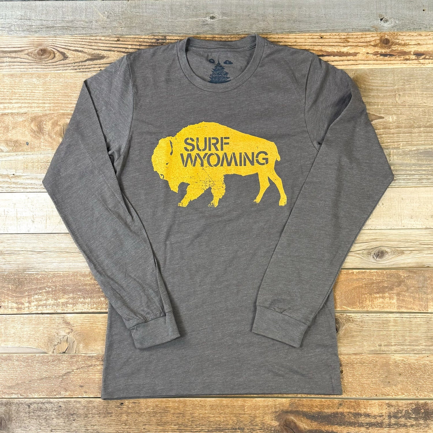 Surf Wyoming’s Gold Bison Logo on a super comfy, unisex long sleeve.
