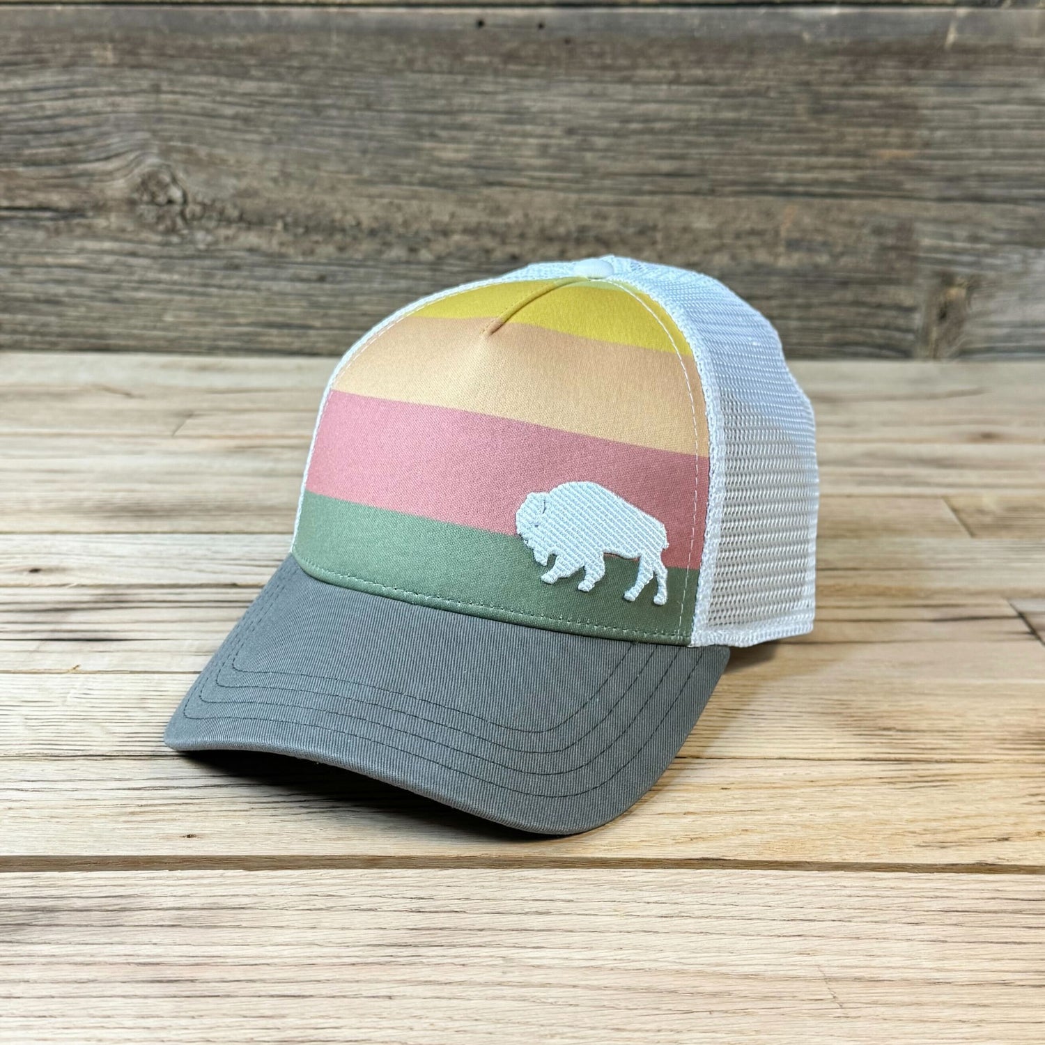 Our First Park Bison Trucker has a 2-panel low crown, full mesh back and a one-size-fits most adjustable closure. Custom designed with a slightly curved bill for a comfy and natural worn-in look and complete with our offset, raised jewel-stitch Surf Wyoming bison logo atop an amazing sunset gradiation front panel design.