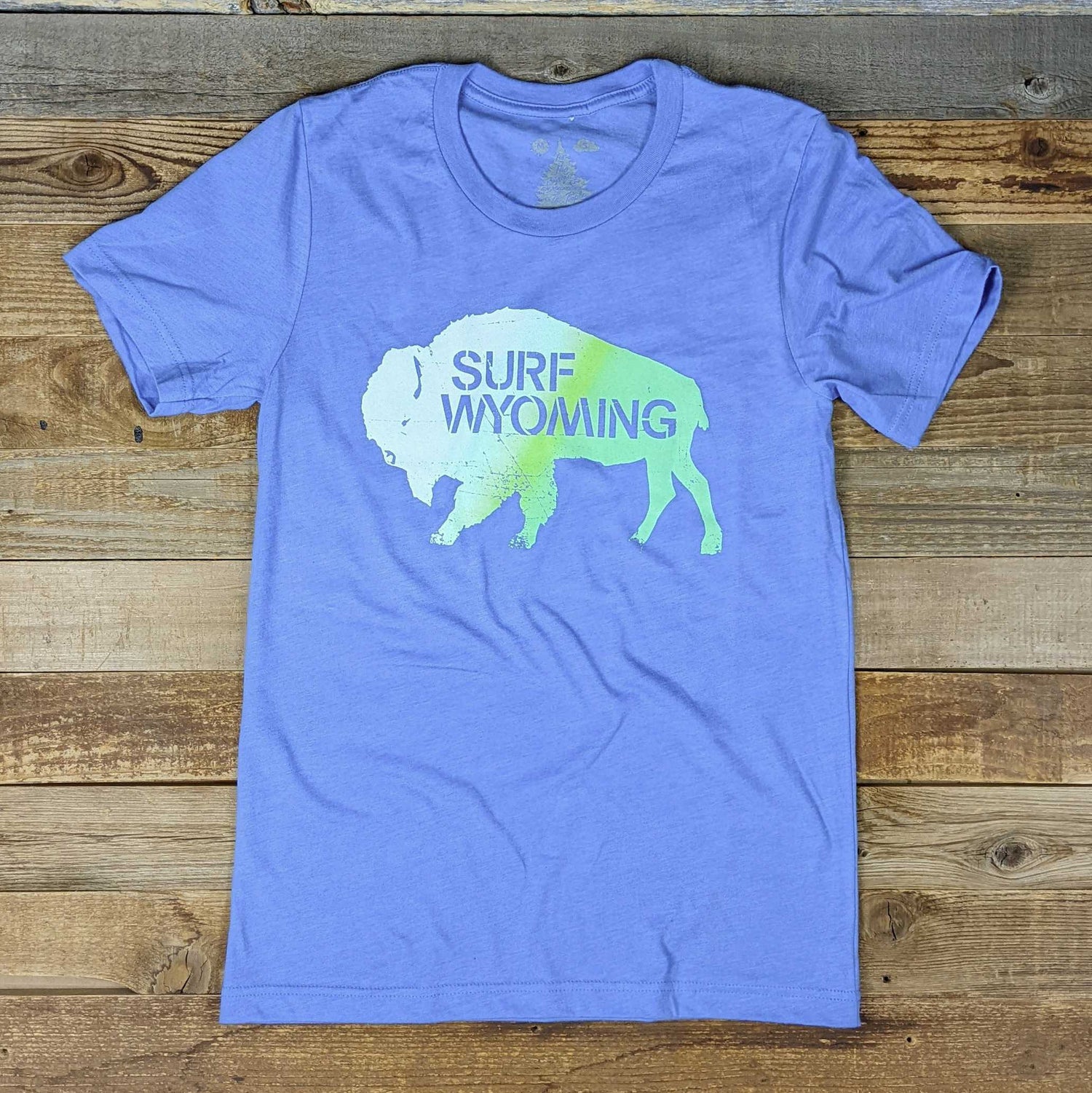 Surf Wyoming’s iconic bison logo in a fade from blue to green atop our super comfy, broken-in combed cotton/poly jersey tee, a 60/40 blend which is both preshrunk and fitted.